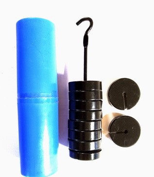 Грузы изготовлены из металла в форме дисков, каждый диск промаркирован по массе 9 шт. по 100 г плюс стержень с грузом и крючком 1 шт. 100 г.
