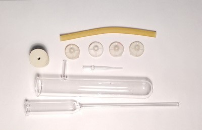 Прибор выполнен из стекла, и  состоит: пробирка с отводом, длинная воронка, резиновая пробка с отверстием, три резиновые чашки-насадки с бортиками и отверстиями в дне чашек, газоотводная силиконовая трубка, стеклянный наконечник для силиконовой трубки.