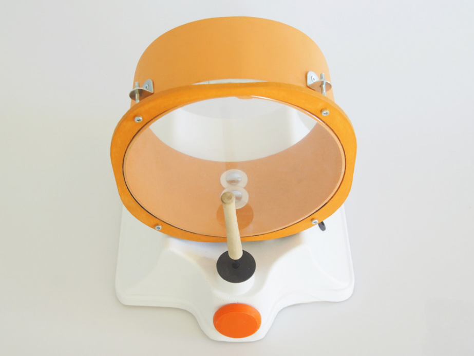 Барабан – это электро-механическое устройство с подвижной частью, предназначенное для занятий с детьми, позволяющее развивать слухоречевой аппарат. Состоит из основы, закрепленного на ней барабана, вращающейся барабанной палочки, кнопки активации электромотора, а также разъем 3,5 мм. Для подключения дополнительного девайса. На нижней части имеется батарейный отсек для четырех элементов питания. Барабан можно активировать при помощи стационарной кнопки расположенной на корпусе устройства, так и подключив через разъем дополнительную выносную кнопку активации. Занятия можно проводить как с одним ребенком, так и с группой детей под руководством педагога.