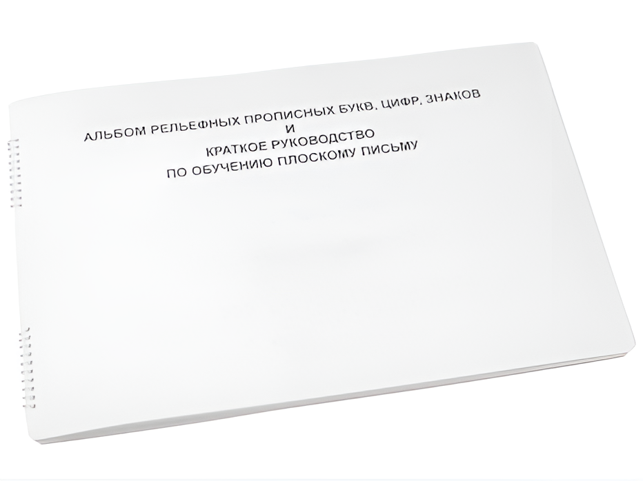 Данное пособие представляет собой альбом рельефных прописных букв, цифр, знаков алфавита Брайля, а также краткое руководство по обучению плоскому письму.