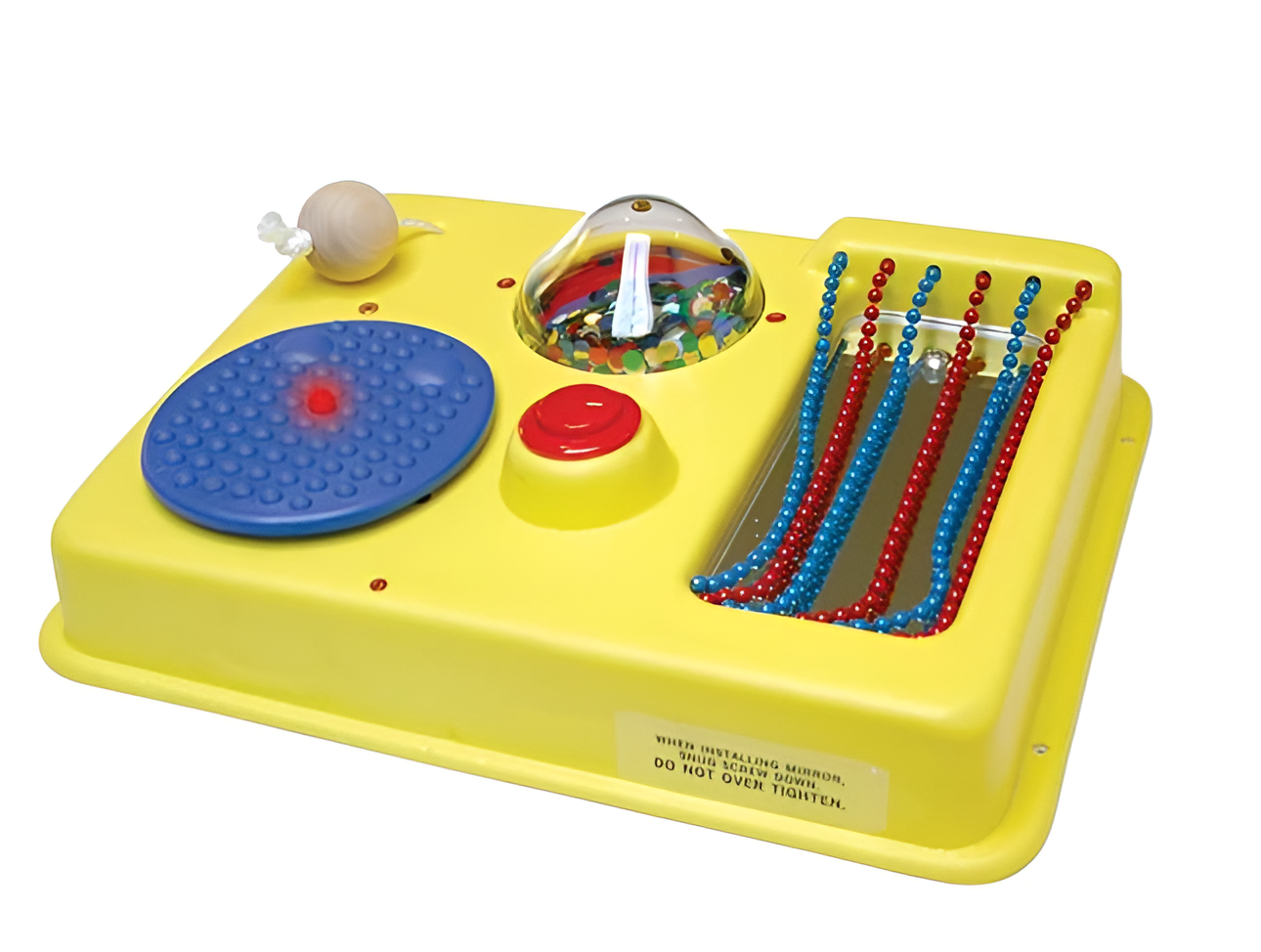 Игра представляет собой яркую платформу, на которой расположены занимательные элементы: занавески из бусинок, прозрачный купол с яркими разноцветными блестками (блески вращаются при нажатии на центральную кнопку), тактильная тарелка (вибрирует и подсвечивается при нажатии на нее), мяч (потяните за него и заиграет музыка).