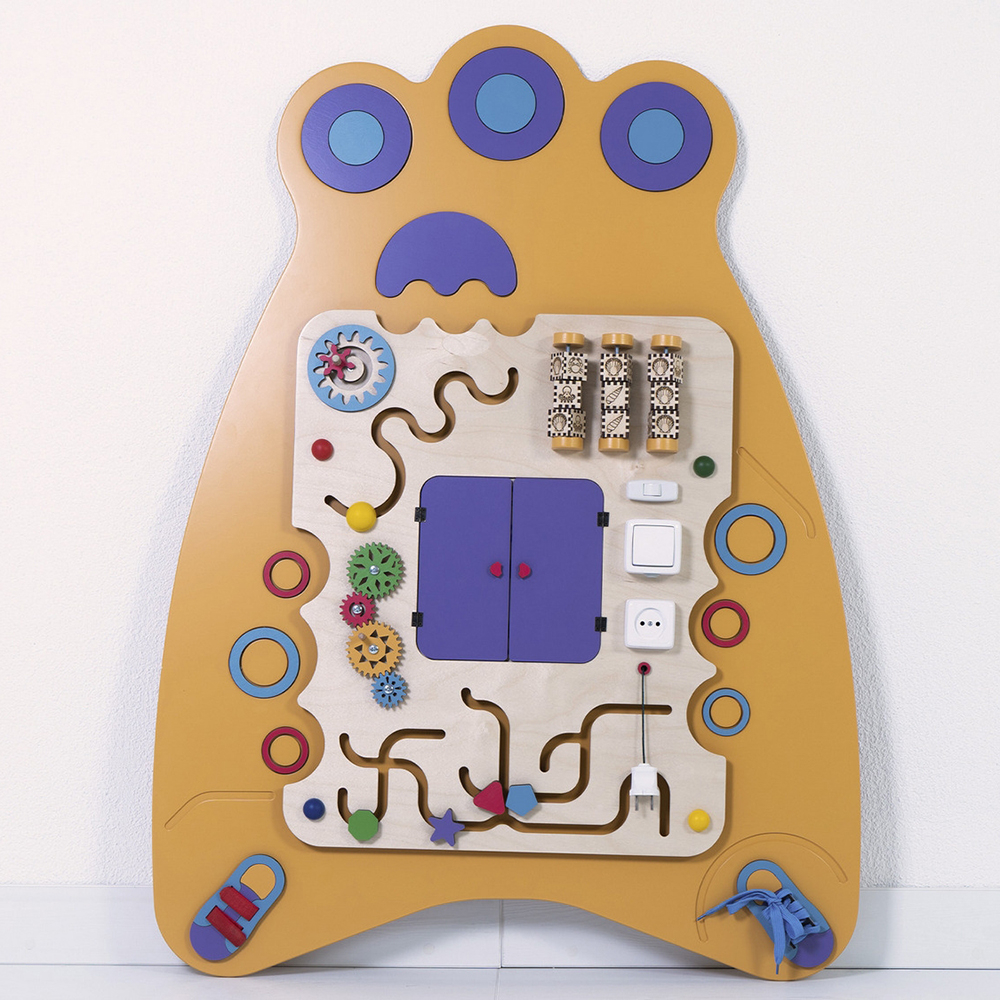 Развивающий сенсорный Бизиборд «Гвазго» украсит стену любого образовательного учреждения. Необычный внешний вид непременно привлечет внимание детей, а встроенные развивающие элементы займут надолго их внимание.
