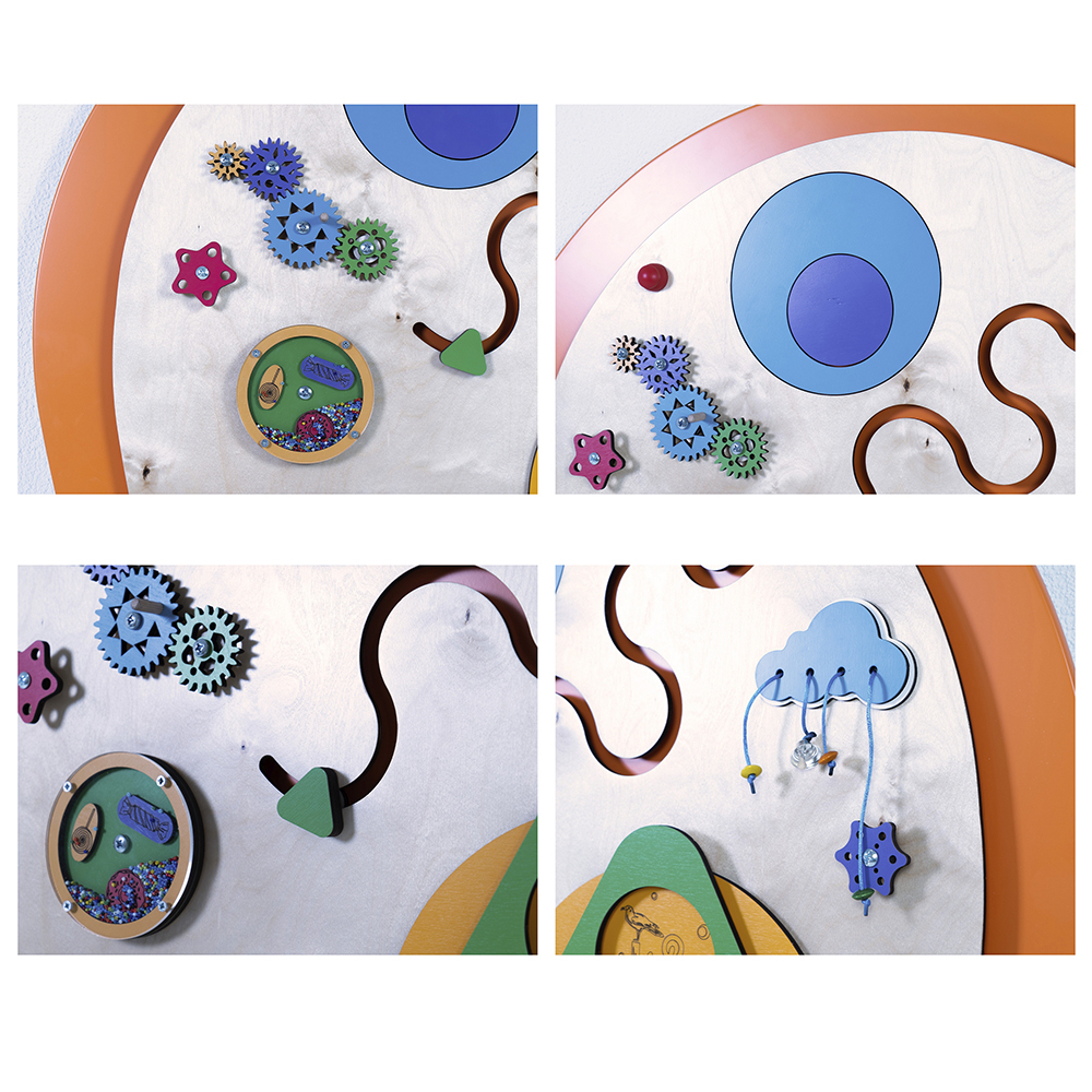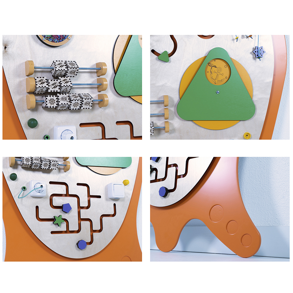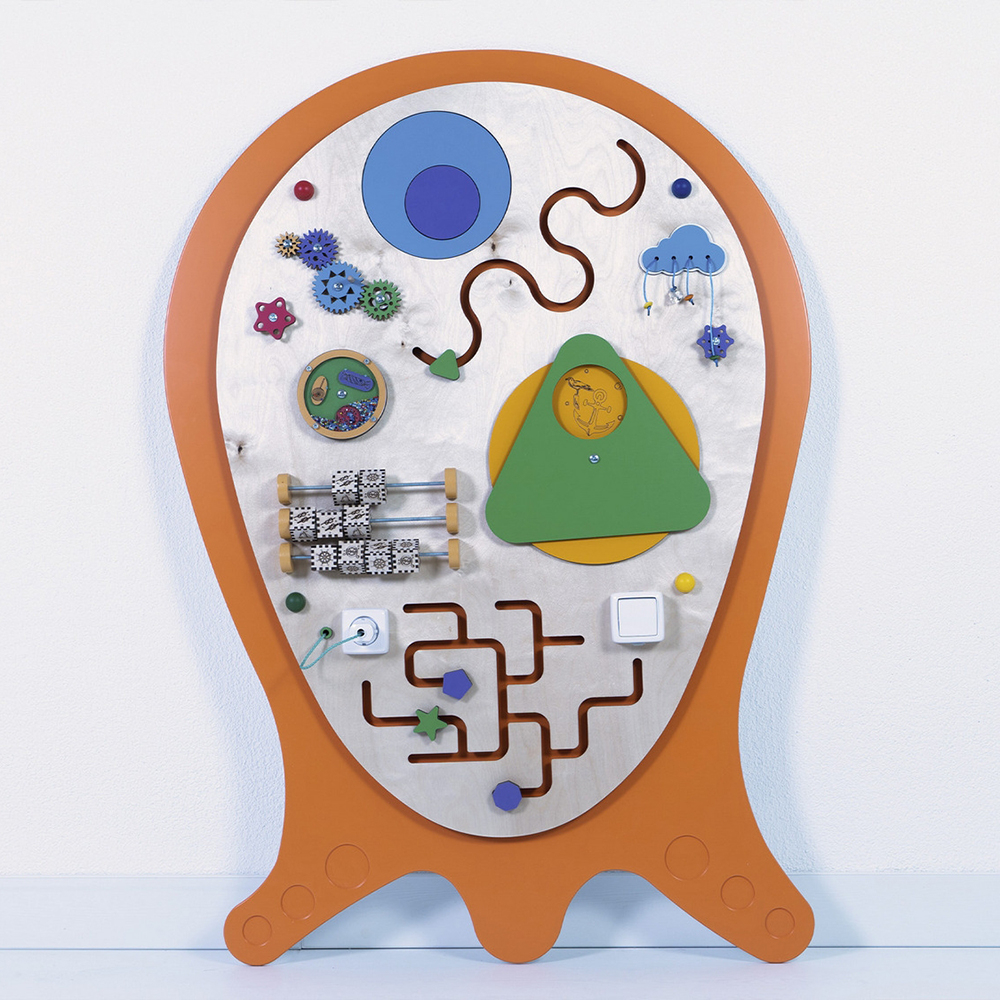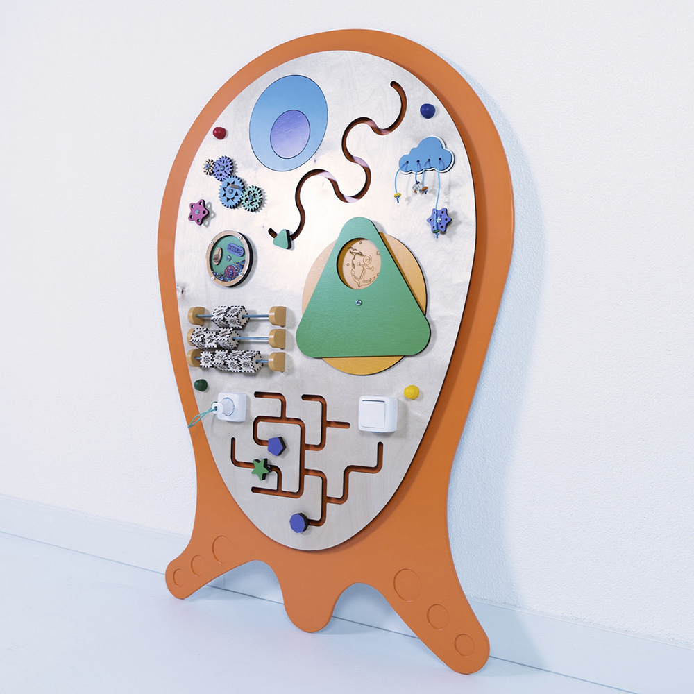 Развивающий сенсорный бизиборд «Крум» украсит стену любого образовательного учреждения. Необычный внешний вид непременно привлечет внимание детей, а встроенные развивающие элементы займут их надолго.