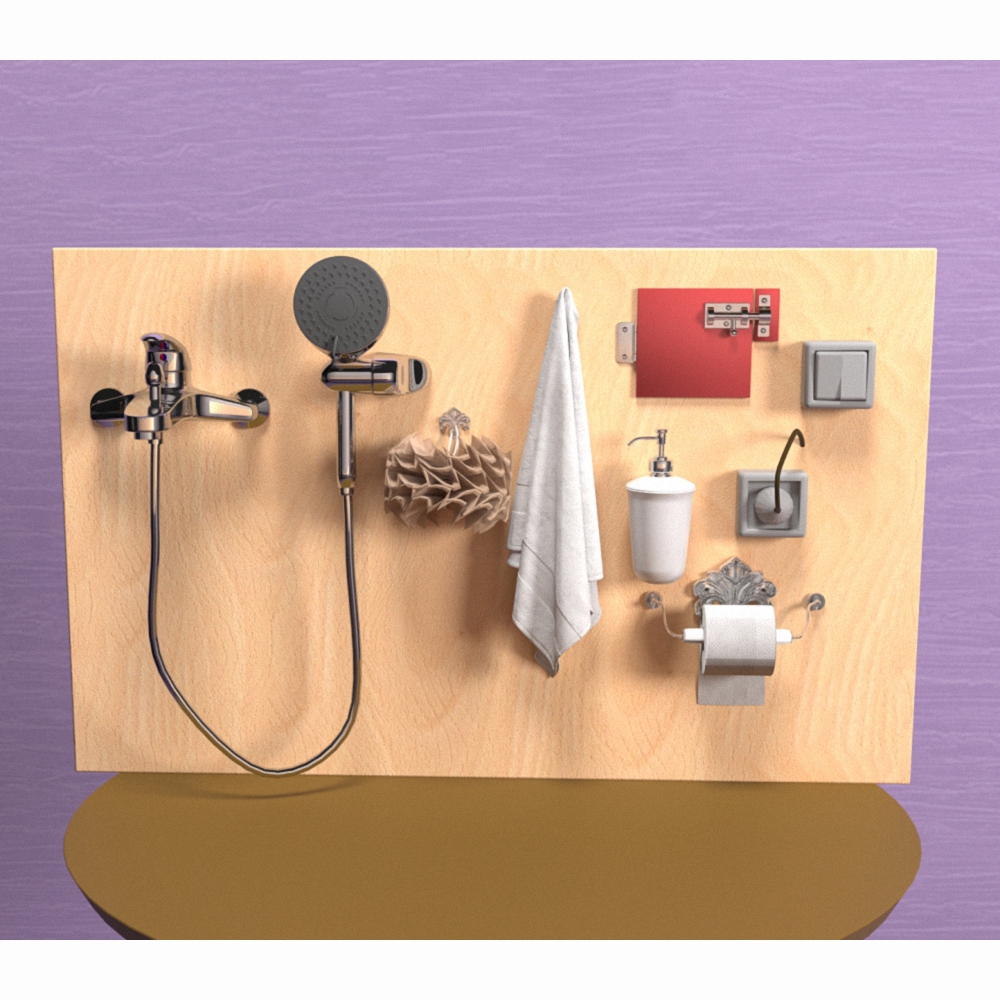 Знакомство с бытовыми делами поможет ребенку освоить элементарные навыки, с которыми он сталкивается изо дня в день. Выключатель для света, кран холодной и горячей воды, застежки - привлекают его внимание и вызывают интерес в повседневной жизни. Тем самым, у ребенка совершенствуются качества самостоятельности и независимости. Во время игры развивается память и мелкая моторика.