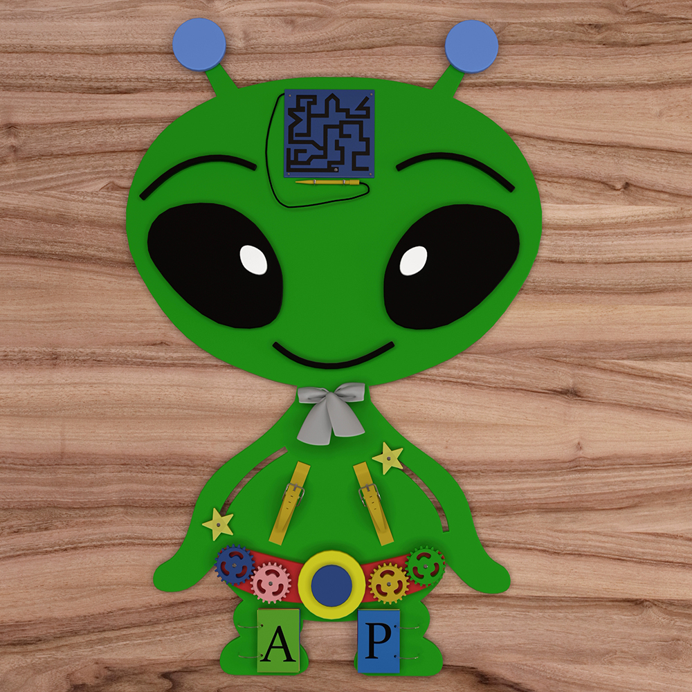 Интересная необычная доска в виде пришельца выполнена из натуральных, а главное безопасных материалов, что позволяет пользоваться бизибордом в домашних условиях, детских садах, а также коммерческих учреждениях, радуя детей на постоянной основе. Разнообразие элементов позволяет придумать огромное количество игр с ребенком как наедине, так и в большой компании.