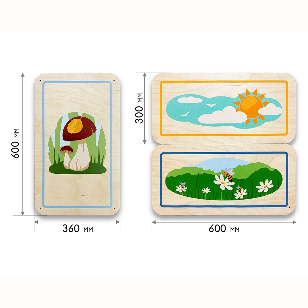 Дополнительные модули бывают однотонные и с тематическими иллюстрациями, подходящими под тематику дидактических панелей. Разнообразие размеров способствует декорированию стен различной конфигурации и масштабов. Параметры варьируются от совсем маленьких модулей 300х300 мм до крупных размеров 600х600 мм.