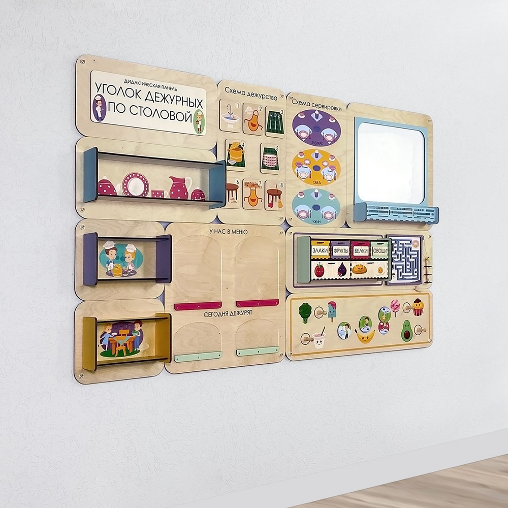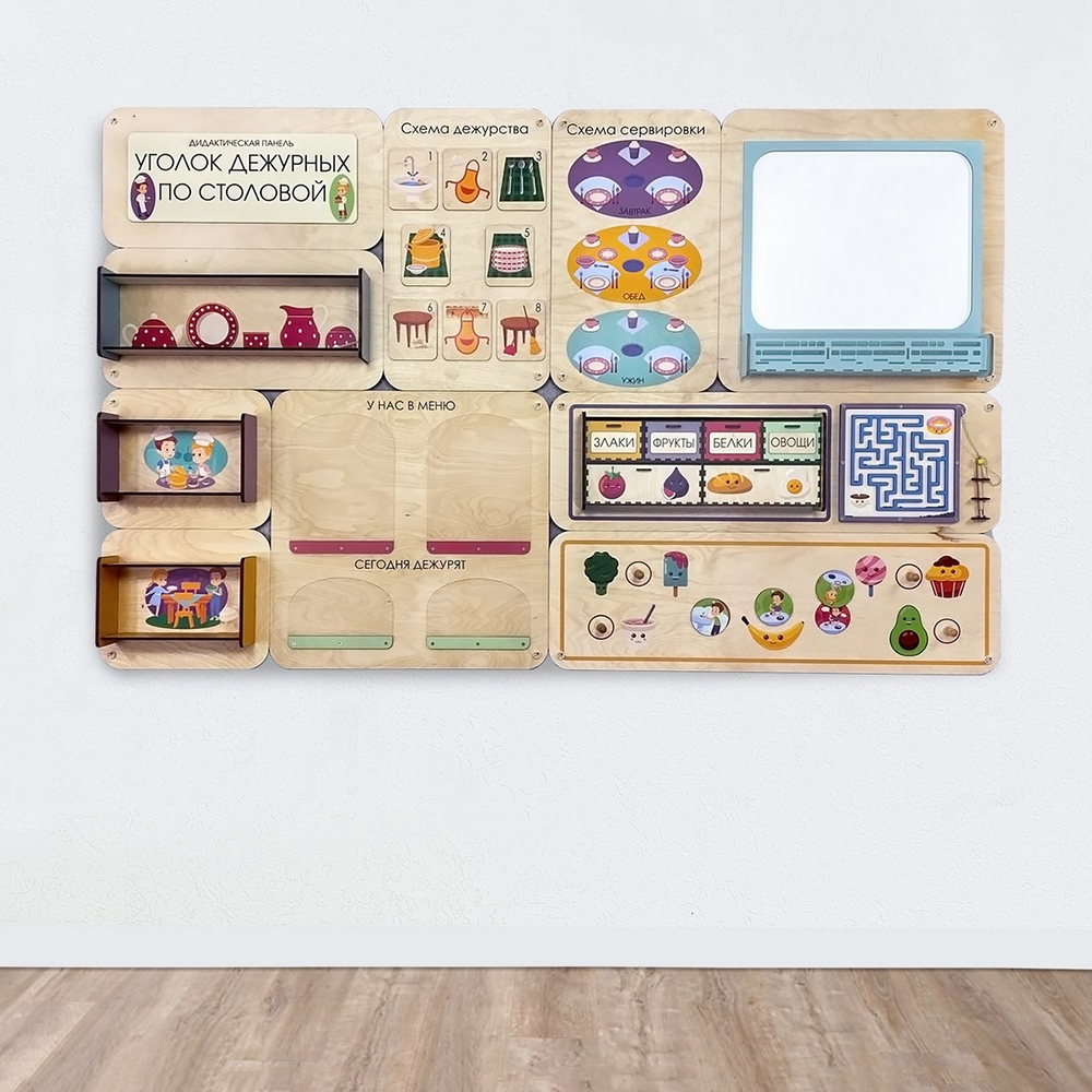 - Занятия с панелью «Уголок дежурных по столовой» нацелены познакомить детей с меню питания, графиком дежурств, полезными продуктами, правильным поведением за столом. Дети приобщаются к посильной работе, учатся заботиться о коллективе.