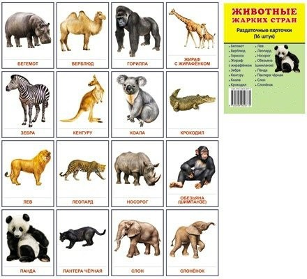 На одной стороне карточки - цветная иллюстрация и название животного на русском языке, на другой - название животного на русском и анлрийском языках.