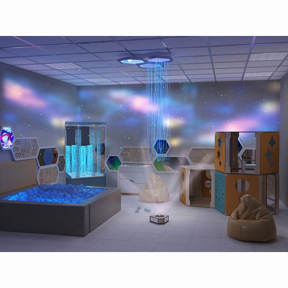 Для оформления потолка в сенсорных комнатах отлично подойдут потолочные панели. Шестигранные светильники мерцают в темноте словно иллюминатор, ведущий в глубины загадочного космоса. Это завораживает внимание малышей, нормализует работу нервной системы и успокаивает пульс, помогает расслабиться и отключится от тревожных мыслей.