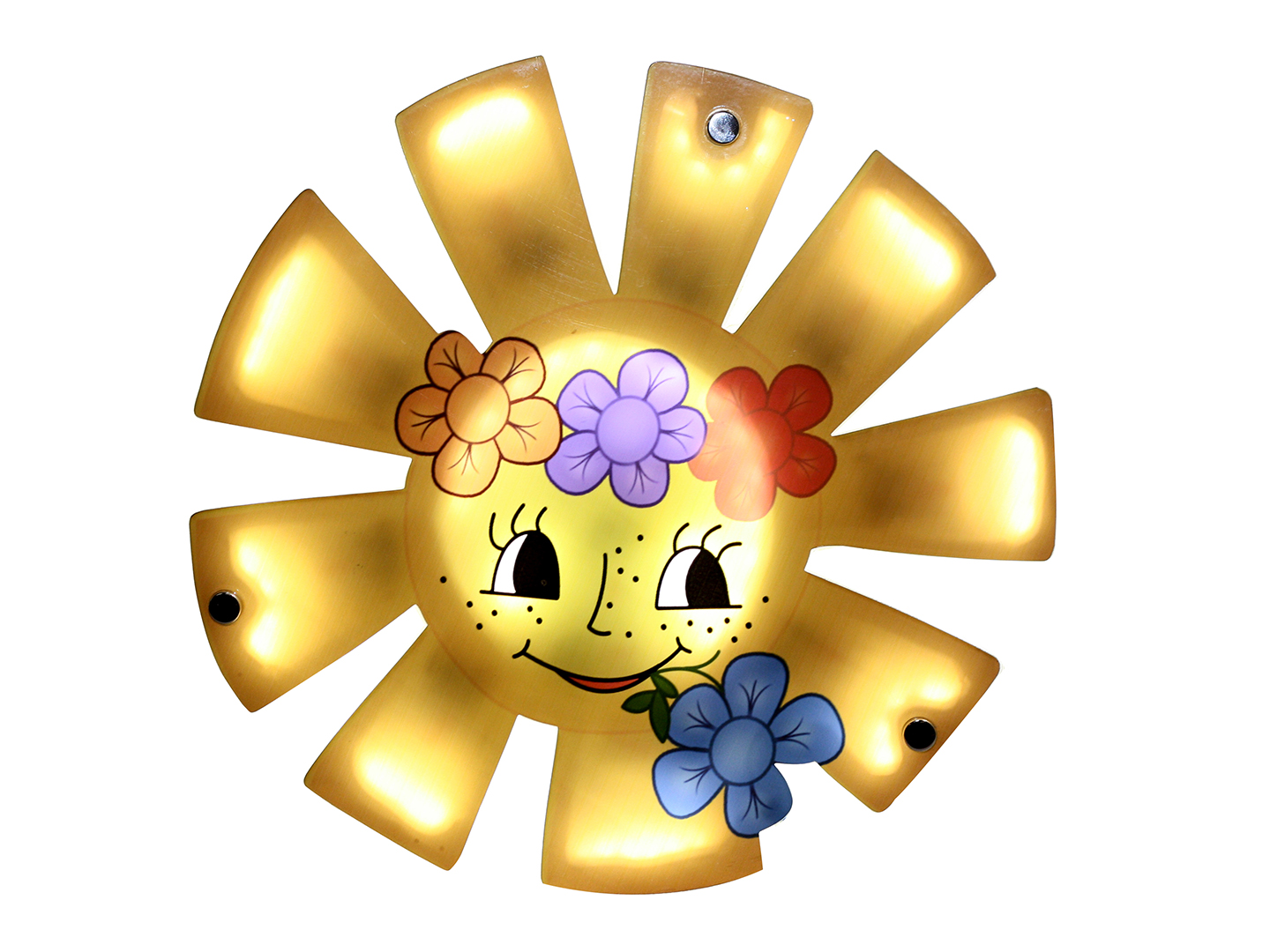 Солнышко, реагирующее на прикосновение пальцев. Загораются глазки, ротик, лучики солнца. Диаметр 30см.