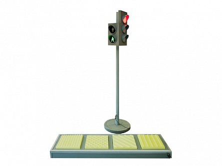 Электрифицированная модель транспортного и пешеходного светофоров на стойке и основании с "Виртуальным учителем" и с панелью образцами тактильной тротуарной плитки для слепых и слабовидящих пешеходов