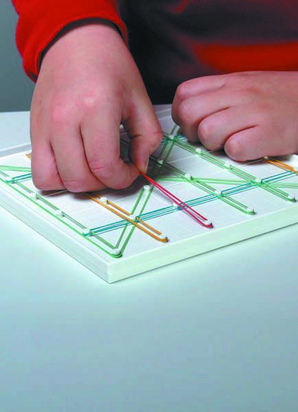 Игровое поле геоборда – пластиковый планшет с выступающими колышками, расположенными с одинаковыми промежутками по горизонтали и вертикали, за которые можно цеплять входящие в набор резинки и «рисовать» геометрические фигуры. С одной стороны игрового поля расположена сетка колышков с промежутками в 3 см. С обратной стороны доски колышки расположены по окружности.