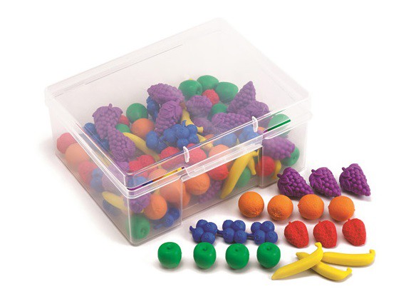 В наборе 108 фигурок фруктов, 6 ярких цветов. Фигурки: яблоко, банан, апельсин, черника, виноград и клубника . Все детали упакованы в контейнер.